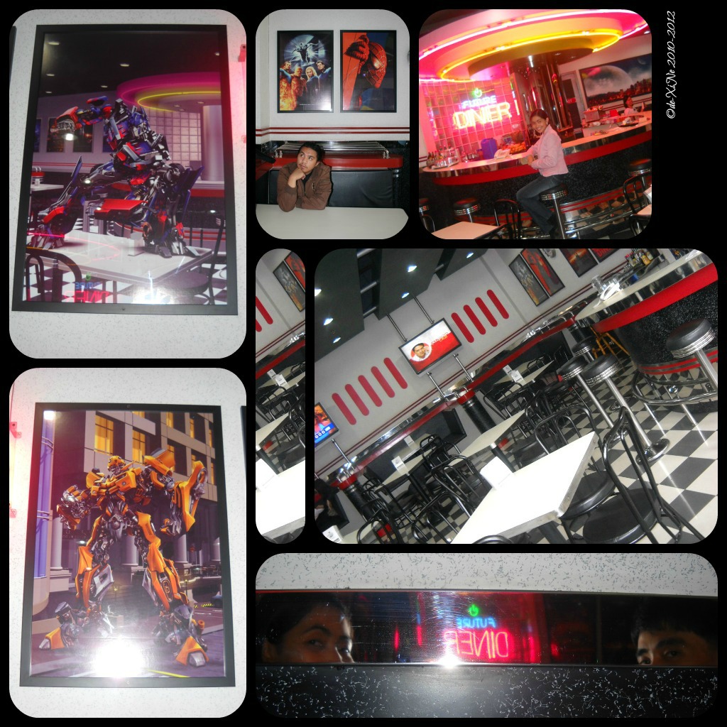 It was the servers who got out from behind the bar to give us the menu. It was an interesting sort of menu with dishes like cosmonaut salad, astro’s delight, and carburanus pasta. Pizza was referred to as flying saucers, set meals were called traveler’s surprise, and the shakes were categorized under ozone drinks. We ordered the big bang burritos, the robotics meal (a very meaty meal with steak, pork chop, chicken and hotdog) as well as the ozone drinks, space forest and cloud rangers. The server took our order and confirmed it with us from memory. (All hail, server!) While waiting for our orders, we busied ourselves with the decorations hanging on the walls, movie posters of Spider-Man, Iron Man, Fantastic Four and Transformers. Of note, are the posters of Optimus Prime and Bumblebee. Optimus was depicted standing on one of the tables in the diner and Bumblebee was standing in front of Hotel Supreme.