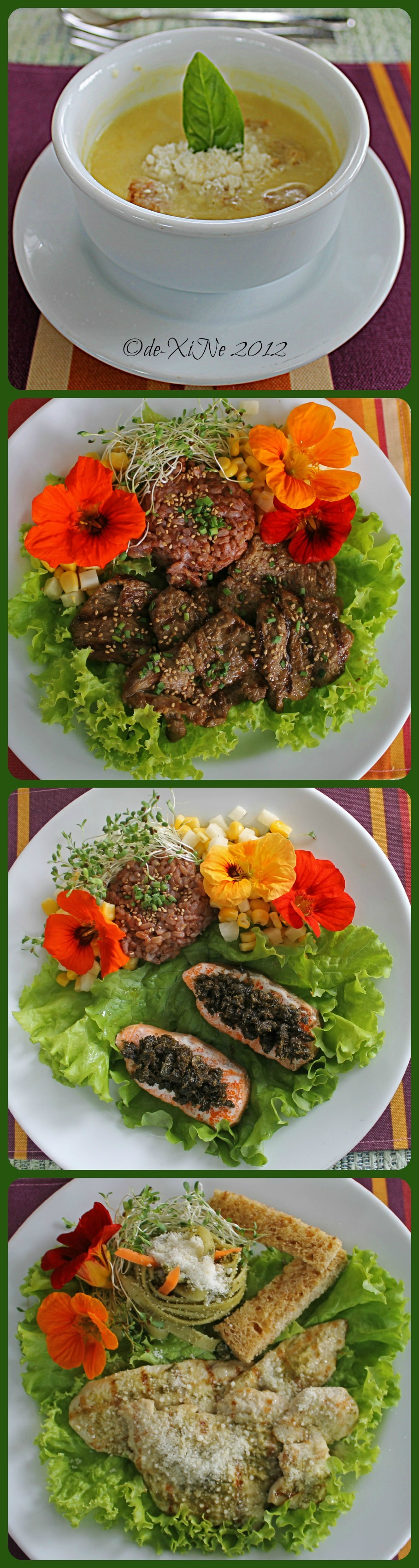 Soup: Base of onion and squash with seven herbs. Main Course: Tenderloin soaked in sake, strawberry wine, honey and herbs; steamed Norwegian salmon with caper dressing, and grilled chicken breast with pesto fettuccine and whole wheat buttered fingers.