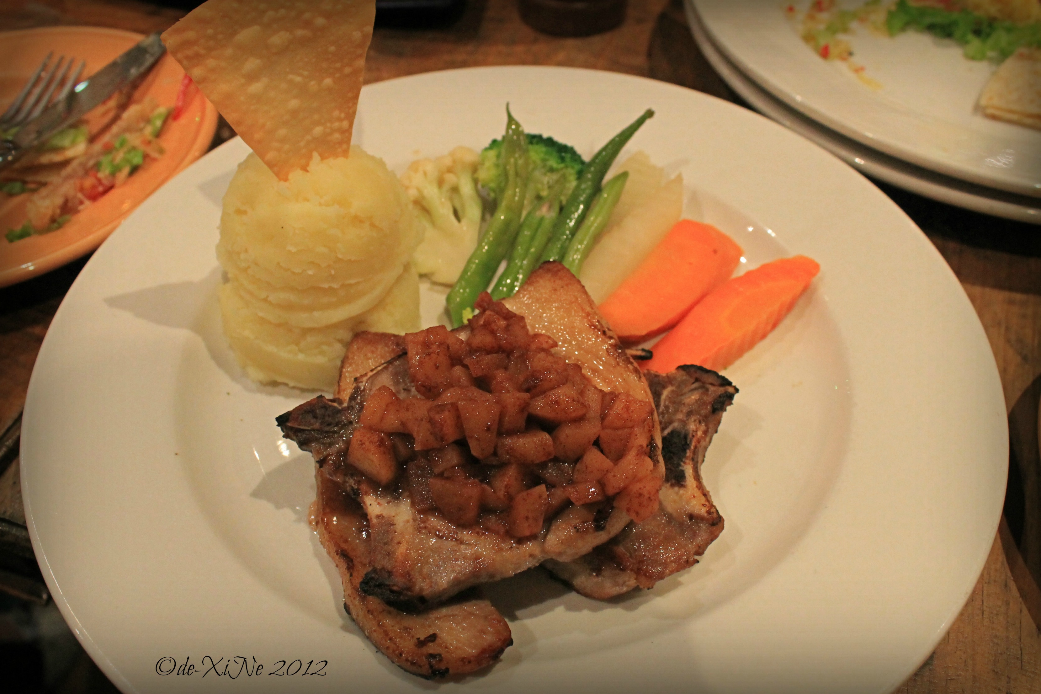 Twin pork chops with chunky apple sauce… my dinner. I think they forgot to give me gravy for my mashed potatoes? So the meal was kind of bland but then the quesadillas (photo bombing on the upper right) made up for it. (Ms. Sam will testify to that, too.) =D