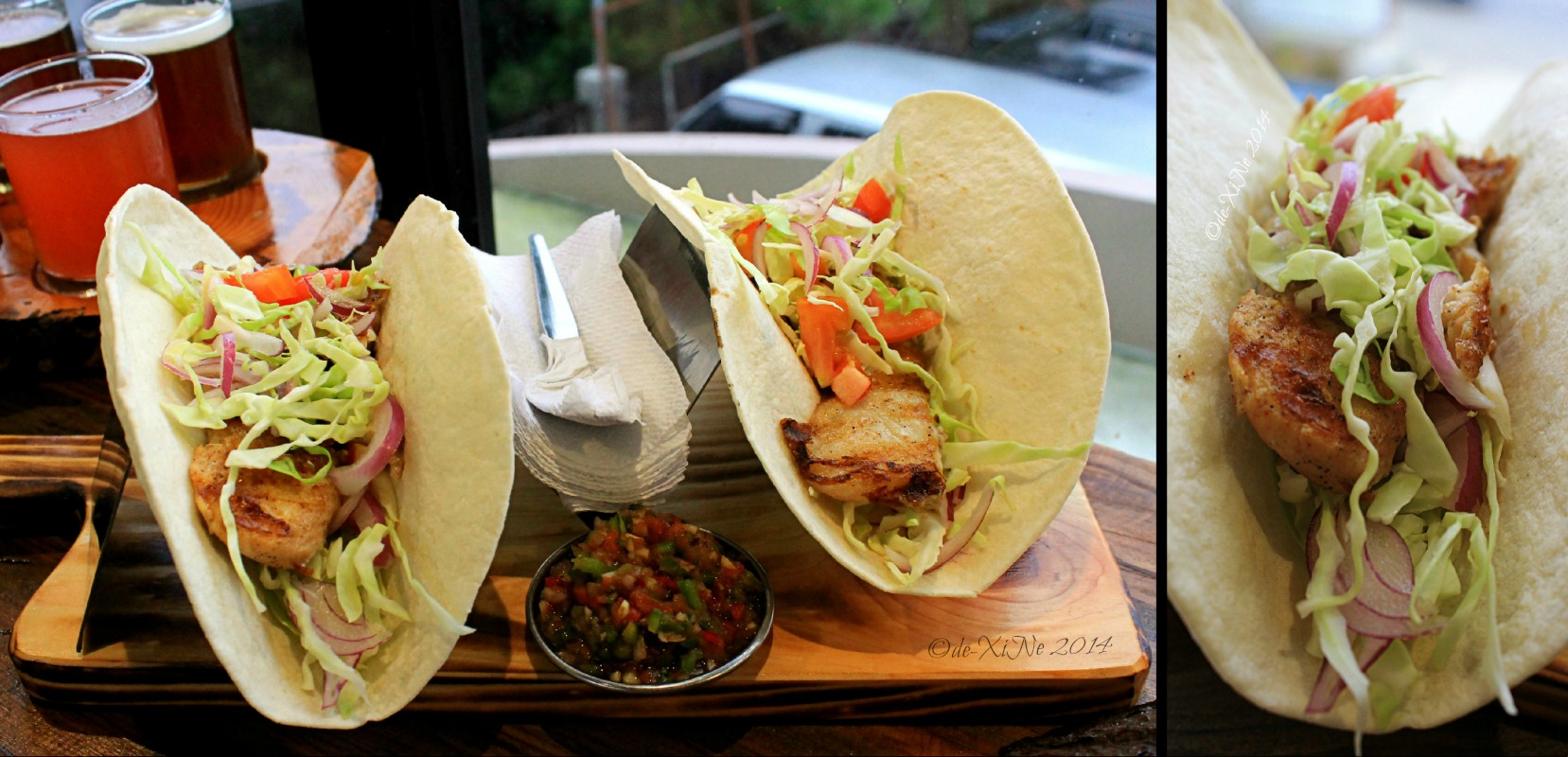 After a little sip from every glass, our order of fish tacos was delivered to the bar. I found it was a good board of tacos, good pita bread, crunchy fresh vegetable strips and succulent enough fishy cubes =D; when I finally figured out how to get a bite of it. (Ah messy … I really don’t know how to eat tacos.) I wanted the salsa to have an extra squeeze of lime and pinch of salt although we did finish it off.