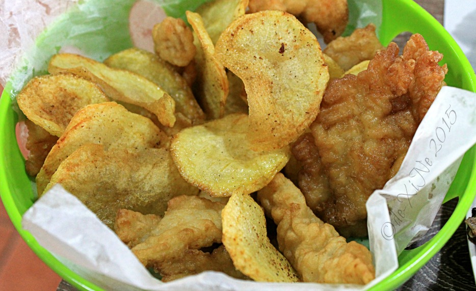 I didn’t think our server would bring all our orders to the table in one go so I ordered a basket of fish and chips. The potato crisps, I loved (but of course) and the fish, while we thought was all right, had us looking for some sort of dip. Tartar sauce, maybe? (Various dips like soy sauce and vinegar and chilies can be found beside the cake display case.) A lemon squeeze, perhaps?